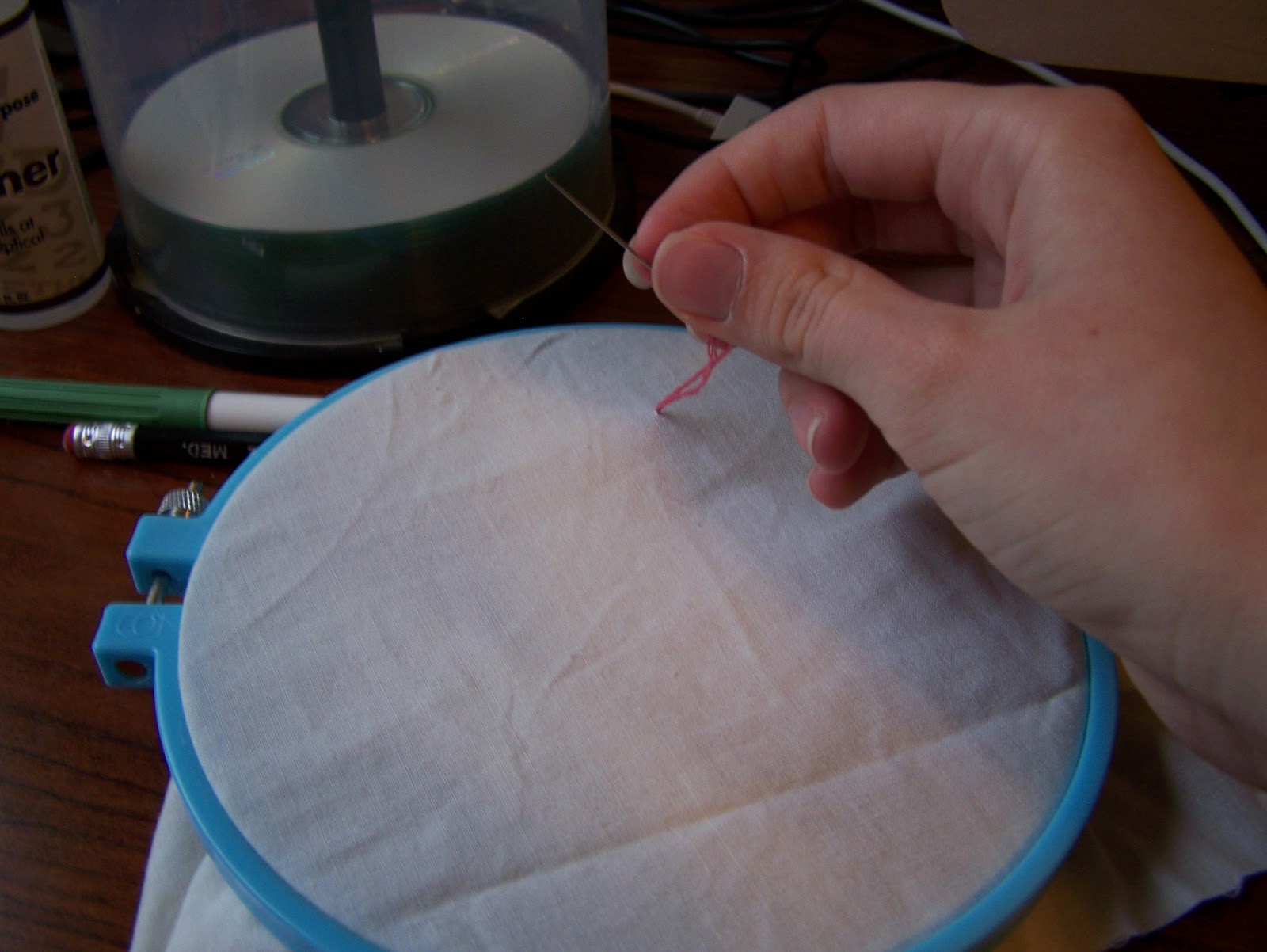 First things first, you will find with embroidery thread that there are multiple strands of thread in the thread, making it thicker. I believe the standard is 6 strands per thread, but you're only going to need 3. To get the strands, take the thread and look for mini-threads in it. (This may be harder for people who can't see as well.) Take three, and slowly pull the strands and the rest of the thread away from each other. Cut your thread before you do this.